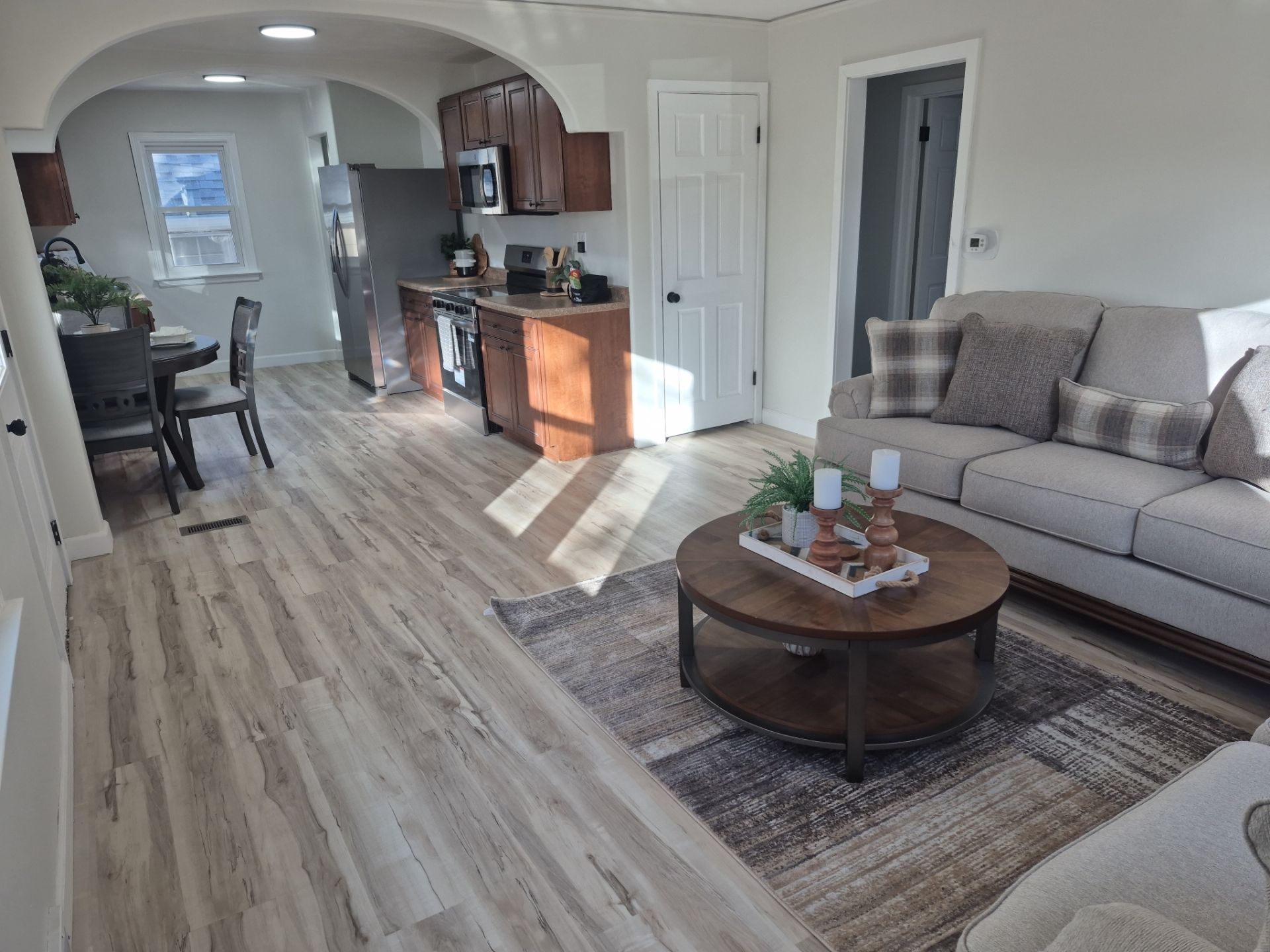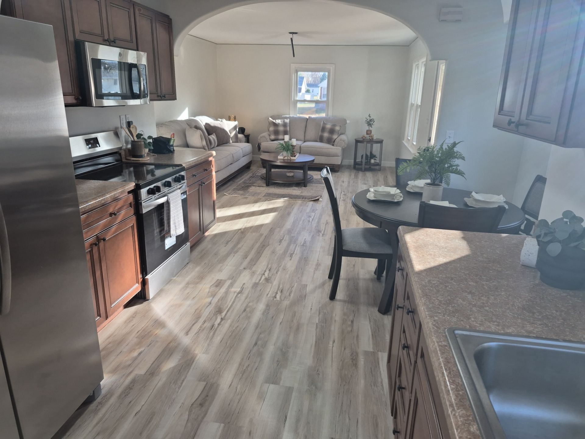 The kitchen includes new stainless-steel appliances (dishwasher, microwave, oven) and opens to a cozy dining and living area with beautiful flooring and neutral tones.